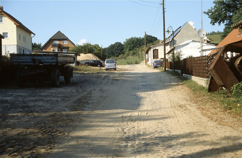 Der letzte Blick für diese Seite geht aus dem nördlichen Giebelfenster des vorletzten Hauses in der Triftstraße (dem ersten Neubau nach der Wende) über ein Stück des Nachbargrundstücks hinweg und zeigt eine kurzen Abschnitt der Triftstraße, während sich dahinter nach rechts Sacks Berg erhebt, von dem wir bereits manche eindrucksvolle Aussichten präsentieren konnten.