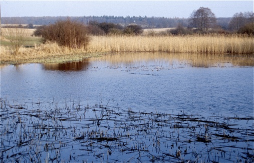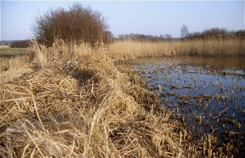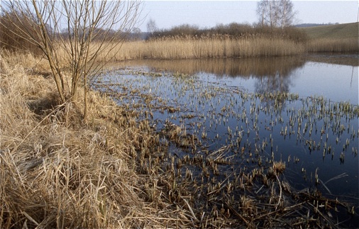 Fast das gesamte Ufer wird durch einen Schilfgürtel gesäumt, nur an der nordöstlichen Seite kann man bis ans Ufer herantreten.