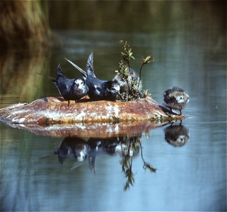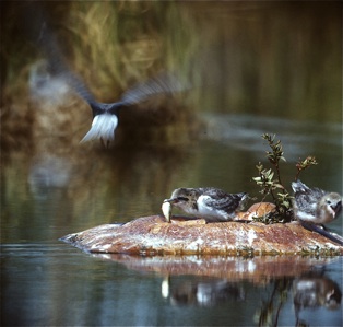 Die beiden Fotos zeigen den erfreulichen Bruterfolg an einer der Plattformen; die Altvögel mausern bereits, deutlich erkennt man die hellen Federpartien im Gesicht, welches ansonsten im Brutkleid rußschwarz ist.
