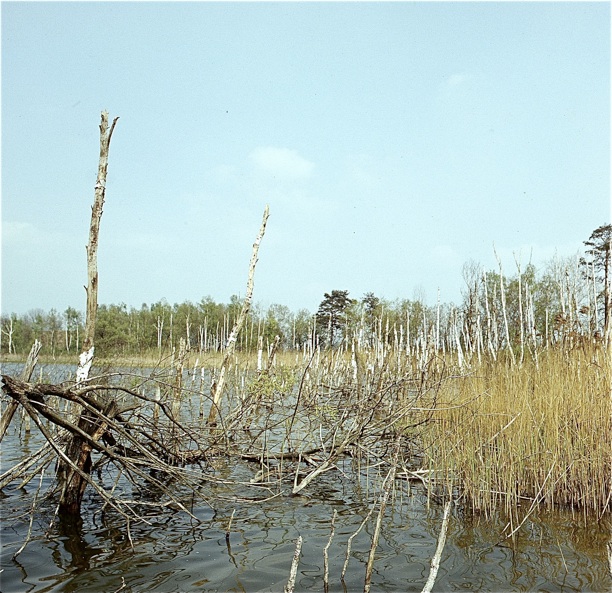 Wer den See nicht genau kennt, würde nie darauf kommen, welche Buchten bzw. Uferbereiche hier zu sehen sind. Links deutet sich der Kiebitzwerder an, der hier noch eine Insel ist. Der Wasserbereich im Vordergrund existiert seit langem nicht mehr. Hinten sieht man die große Südostbucht, dazwischen zieht sich die schmale Bucht, die sich zur Spitze hin zu einem bauchigen Kessel erweiterte, nach rechts über den Bildrand hinaus in südliche Richtung. Sie führte etwa bis 1998 vollständig Wasser, ab 1999 war ihre Spitze vom Hauptsee abgeschnitten und damit eine isolierte Lache, welche schließlich ab 2001 fast vollständig zugewachsen war. Ihr Übergang zum Hauptsee ist durch eine Ge-ländeschwelle markiert, die hier durch die aus dem Wasser ragende flache Vegetation angedeutet ist.