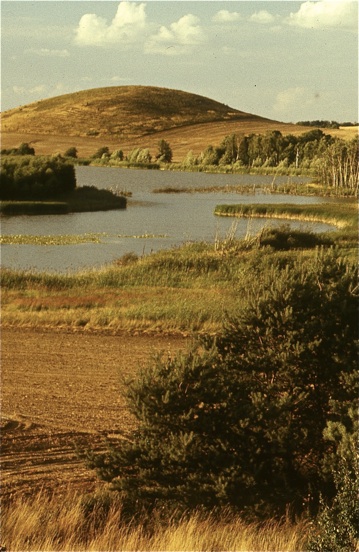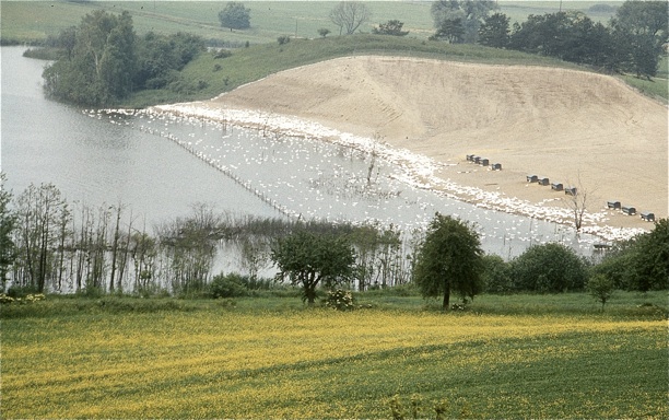 In den 1970er Jahren gab es am Nordufer, und zwar am Hang des Rosmarinbergs, der hier noch völlig kahl ist, eine Entenfarm. Der Kamerastandpunkt befindet sich bei dieser Aufnahme am Hang des Kleinen Rummelsbergs, wodurch man eine gute Draufsicht hat.