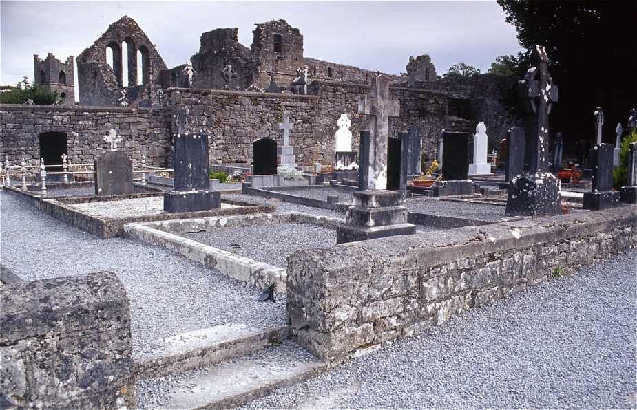 Das Foto zeigt von der eigentlichen Ruine, die hier im Hintergrund zu sehen ist, recht wenig, es dominiert eher der Friedhof.