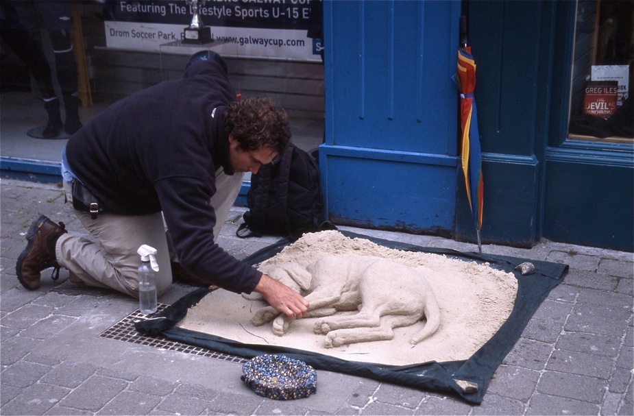 Straßenmusiker und Künstler präsentieren ihr Können; auf unserem Weg zum Hafen fiel uns z.B. dieser Hund aus Sand auf, der auf dem Rückweg bereits einen Welpen dazu bekam (hier noch als kleines Sandhäufchen im Hintergrund zu erkennen).