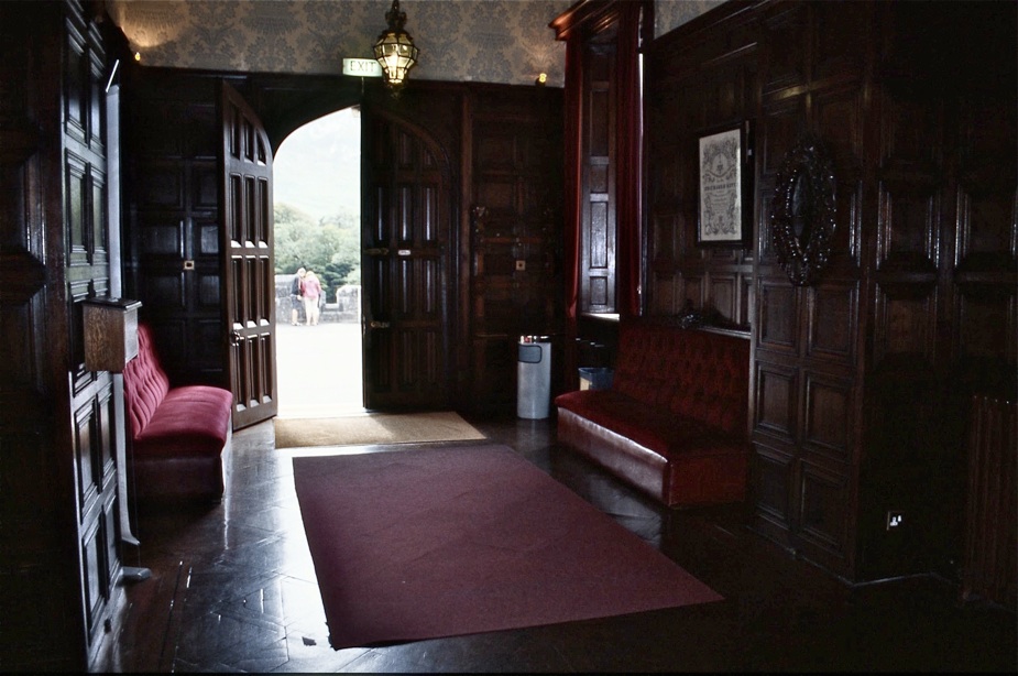 Zunächst betritt man einen relativ dunklen Vorraum (Bild oben mit Blick nach draußen). Nach rechts gelangt man über einen Zwischenraum, von dem eine Treppe nach oben führt in den hellen Rittersaal, der einen Blick auf den Vorplatz gewährt (folgendes Bild).