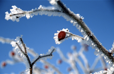 Auf dem Lieper Plateau am 26. Januar 1998; Hagebutte mit Rauhreif, fotografiert mit Fuji Velvia 50 Diafilm