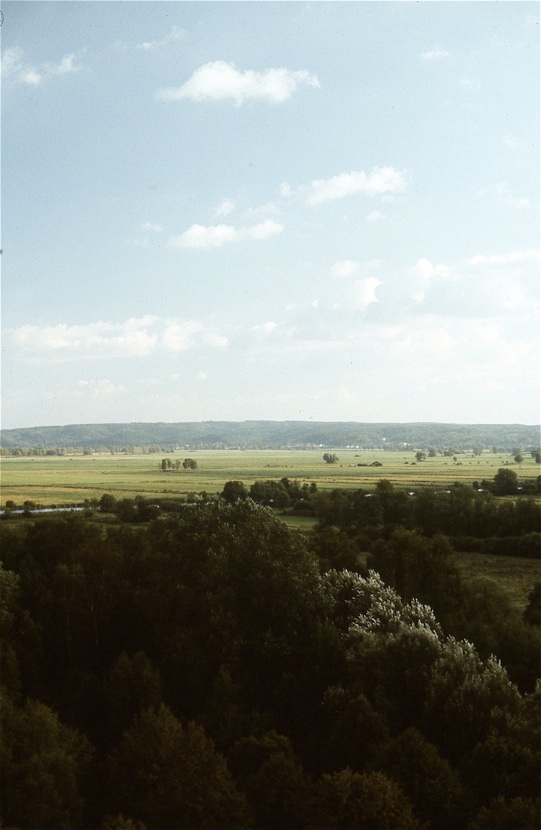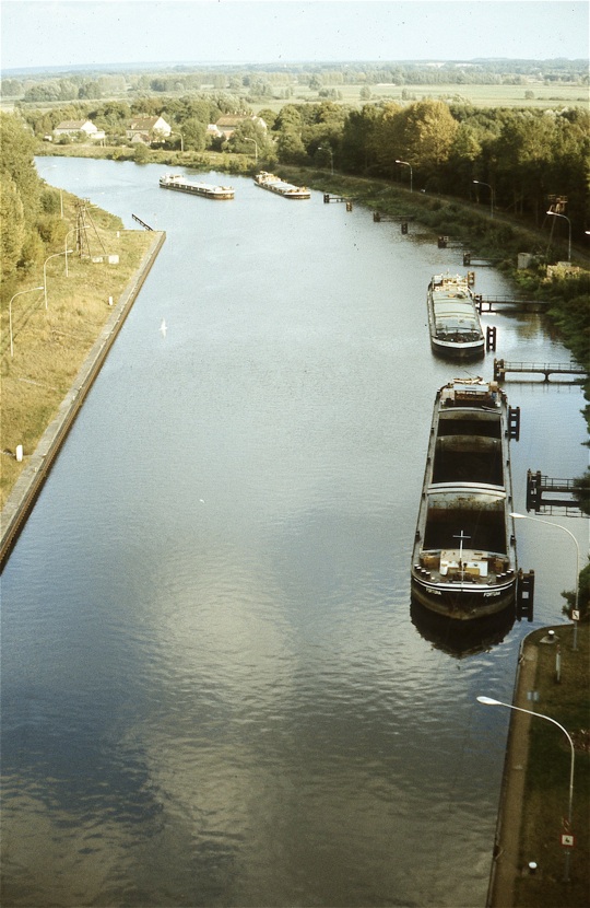 Das Schiffshebewerk selbst ist von mir in jenem Jahr nicht fotografiert worden, dafür aber einige Ausblicke von oben, dazu gehört der klassische Blick auf den Unterlauf des Kanals, aber auch auf das damalige Sanatorium des MdI, das hier hinter den Bäumen hervorschaut (nächstes Bild). Genau an dieser Stelle wird zwanzig Jahre später mit dem Bau des neuen Hebewerkes begonnen, weshalb das Gebäude 2007 abgerissen wurde.