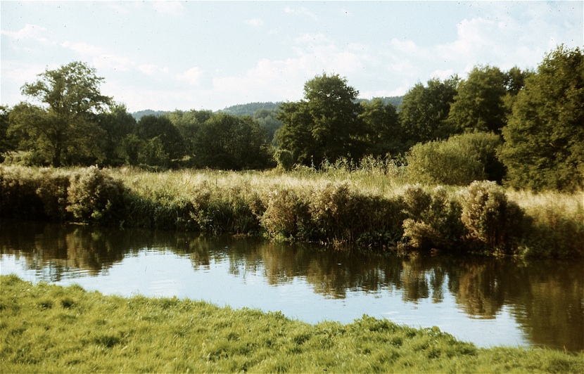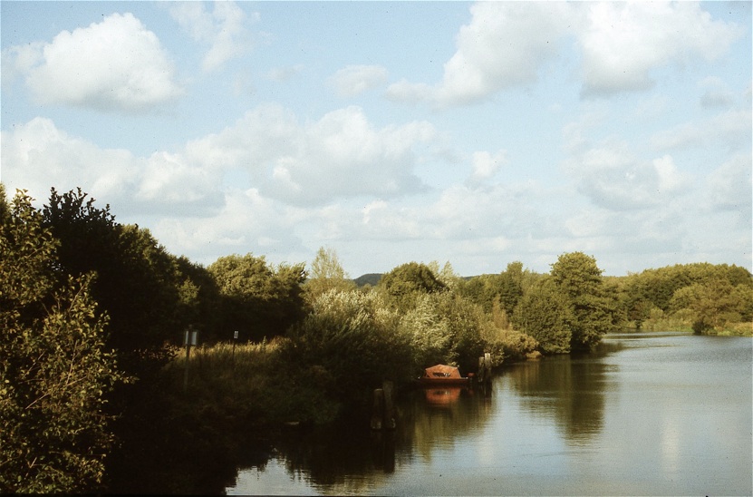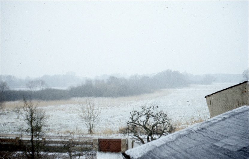 Hier geht der Blick aus dem Wohnzimmer meiner Großmutter zu den Wiesen und dem Kanal. Hinter der Mauer mit unserem rotbraunen Tor verläuft der Sandweg, dessen Zustand vor allem in diesem hier zu sehenden Bereich manchmal erbärmlich sein konnte, wie auf der nächsten Seite gleich am Anfang zu sehen sein wird.