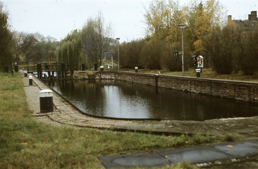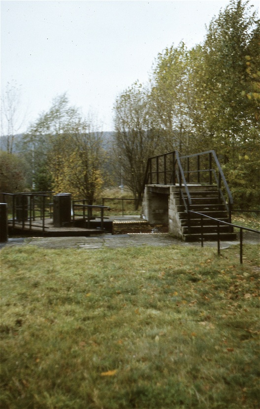 Unmittelbar am unteren Schleusentor, welches ganz links zu sehen ist, überquert die Fußgängerbrücke den Unterlauf. Das trübe Herbstwetter bot wenig Licht, und die dadurch erforderliche lange Belichtungszeit führte zu einer Unschärfe, so dass das Bild hier nicht ganz so groß abgebildet wurde.