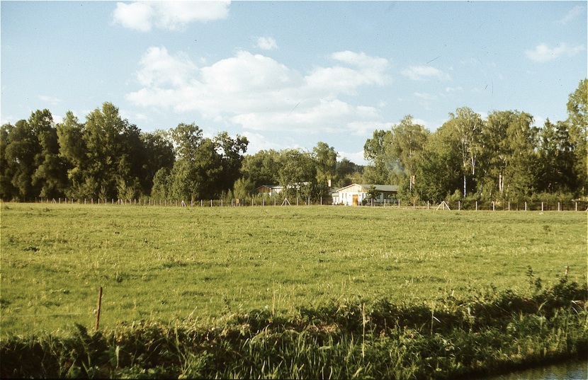 Das ist die Südansicht der Staatsjagd-Anlage, die man erreichte, wenn man hinter der Brücke nach links in Richtung Bralitz abbog. Hier von der Wiesenseite konnte man als Außenstehender am meisten sehen, denn das Anwesen war ansonsten so angelegt, dass man im Vorbeigehen (oder -fahren) möglichst wenig erkennen konnte.