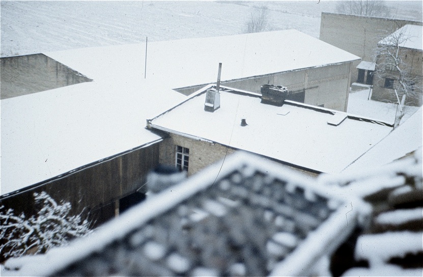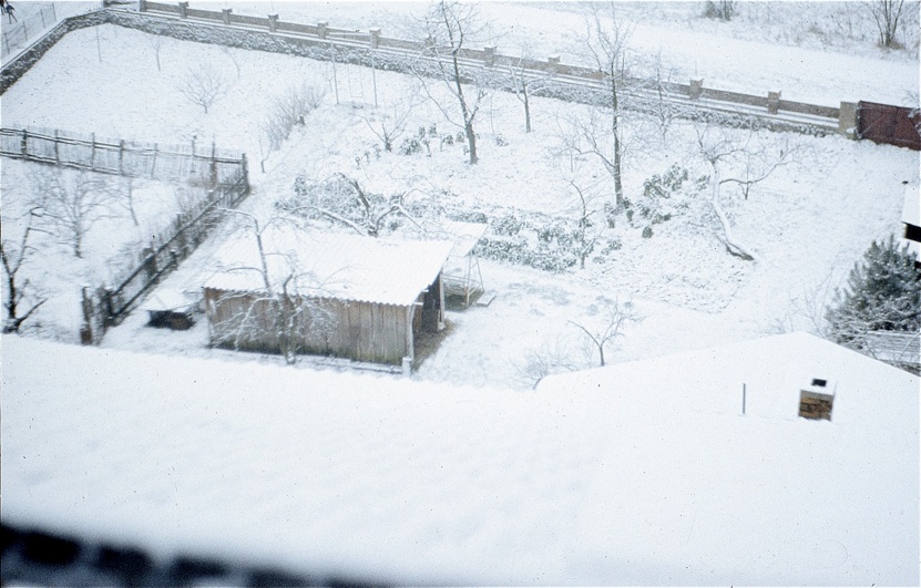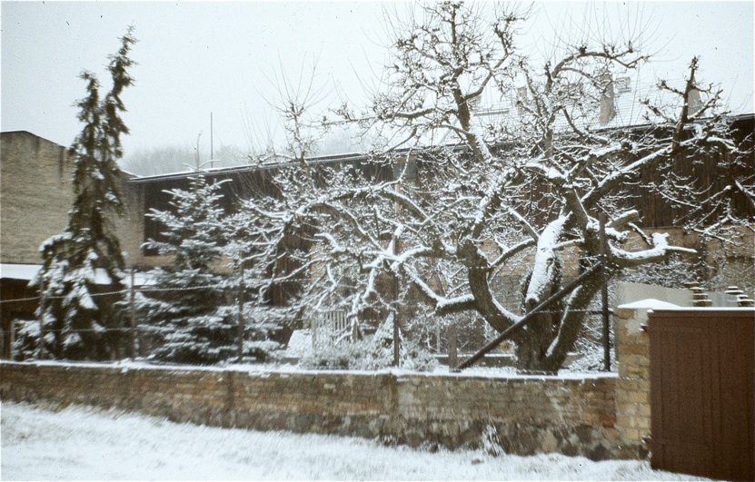 Der Blick aus dem Dachfenster zeigt unseren frisch verschneiten Garten (oberes Bild) sowie die Dächer der Fleischerei Illing und dahinter eine Stück von Torges Bauernhof mit der großen Scheune, die hier noch vollständig existiert (also auch zu Hofseite hin). Mit den Abrissarbeiten wurde in jenem Jahr (wie auf der vorigen Seite bereits erwähnt) noch nicht begonnen (unteres Bild).
