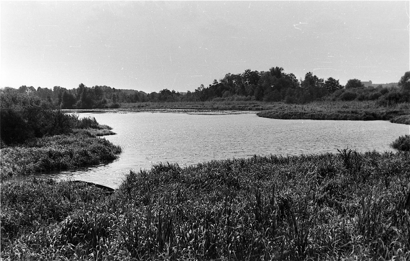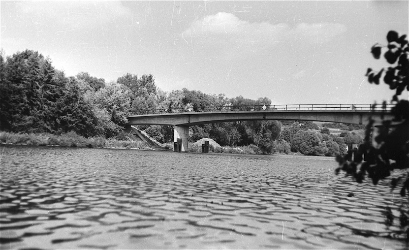 Hier ist der tote Arm aus der Nähe zu sehen, welcher im Winter eine beliebte Eisfläche war. In den nächsten Jahren schrumpfte er durch die fortschreitende Verlandung immer mehr zusammen. Von der zur Brücke hinaufführenden Straße, auf der wir hier stehen, trat man damals nur ein paar Schritte den Hang hinunter und gelangte über einen (hier in der dichten Vegetation verborgenen) Steg zum Kahn, der hier auch nur zur Hälfte zu erkennen ist.