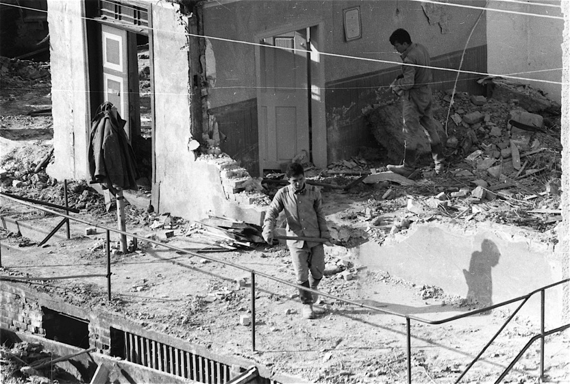 Das Bild oben zeigt die Soldaten bei der Arbeit, und auf dem folgenden Bild (Hochformat) ist nur noch der Keller (wenn man ihn so nennen will) zu sehen. Dieses Foto entstand eigentlich rein zufällig, weil ich den neu erhaltenen Rotfilter ausprobieren wollte, der den sehr hellen Himmel abdunkeln sollte, was aber in diesem Fall nicht richtig gelang; daher stimmt auch der Bildaufbau im unteren Teil nicht, weshalb die Reste der Gaststätte (leider) nicht vollständig erkennbar sind.