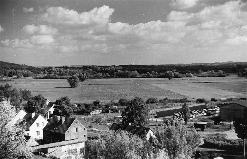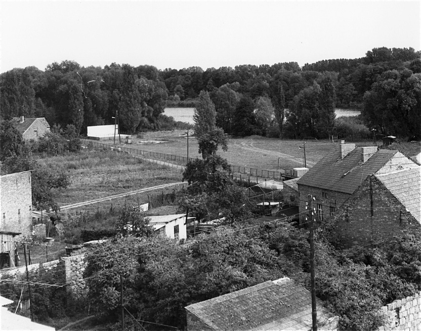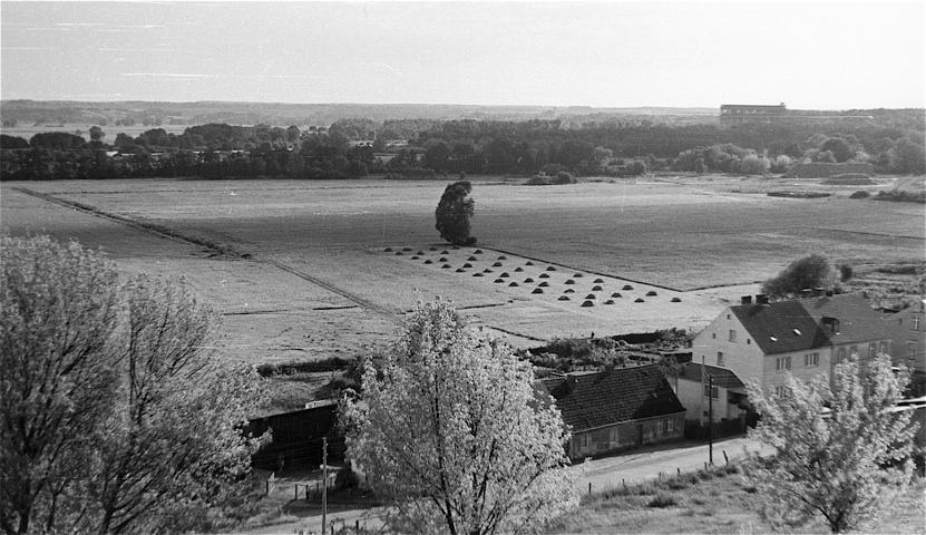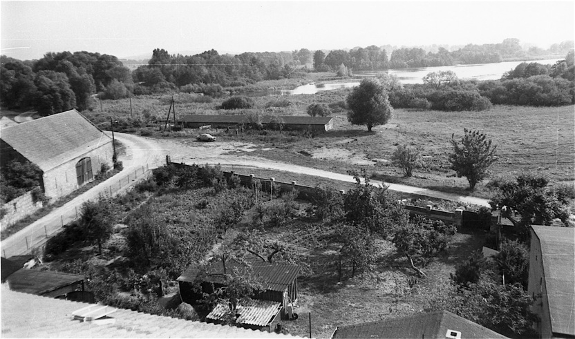 Der Blick nach Süden offenbart (hier mit Weitwinkel, Bild oben) unseren damaligen Garten im Vordergrund, dahinter erkennt man den schmalen, oft zerfahrenen (wie schon gezeigt) Weg an den Wiesen und hinter ihm den flachen Hühner- und Schweinestall, der 1995 abgerissen wurde. Hinter ihm ist der tote Arm zu erkennen. Links zieht die Fischerstraße ihre lange Doppelkurve, bevor sie zur Brücke hinaufführt.