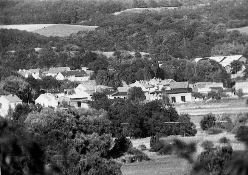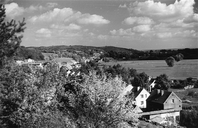 Das Hochformat zeigt den klassischen Blick von Goldbecks Berg auf den Westteil unseres Dorfes. Auffallend ist hier (wie auch schon auf einigen Bildern vorher), dass der Schornstein der alten Bäckerei Seeger noch steht, und auf ihm ist das Storchennest zu erkennen, das nach dem Abriss umgesetzt wurde, und zwar auf einen eigens dafür errichteten Stahlmast ca. 200 Meter nördlich, kurz bevor die Waldstraße auf die Brodowiner Straße trifft.