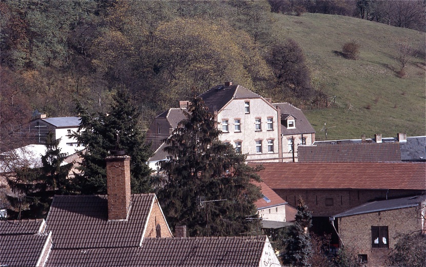 Hier geht der Blick über die Häuser der Brauerstraße hinweg, wobei ganz links die Rückansicht der Gaststätte „Zur Guten Hoffnung“ (großes Haus) zu sehen ist.