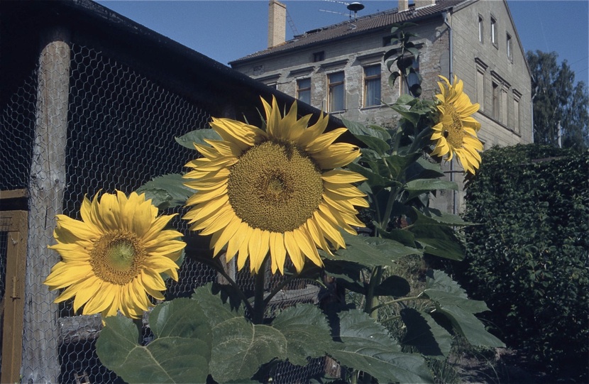 Das erste hier nun präsentierte Bild wurde vom Garten aus gemacht und zeigt im Vordergrund eine unserer Vogelvolieren (hier waren damals Zwergpapageien untergebracht) mit ein paar Sonnenblumen davor, während sich im Hintergrund das bekannte Wohnhaus erhebt.