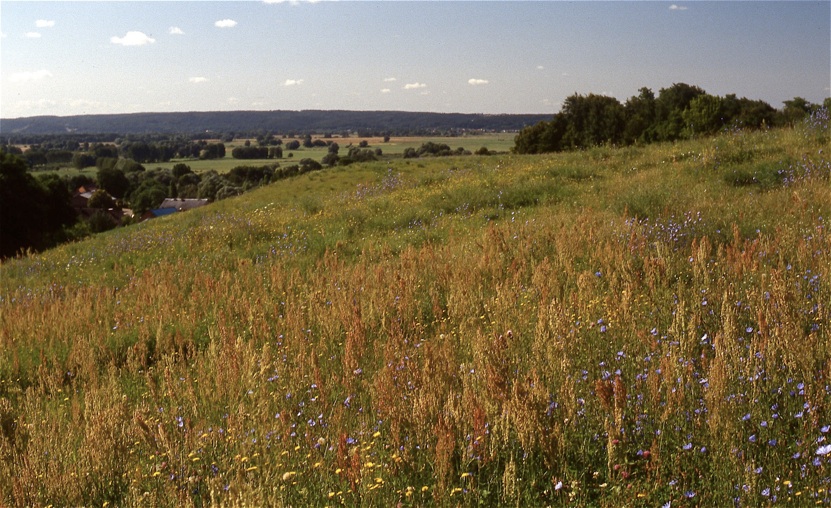Hier geht der Blick über die blühenden Bergwiesen hinunter zum Niederoderbruch, welches im Hintergrund zu sehen ist, während am Horizont der Höhenzug des Barnim verläuft.