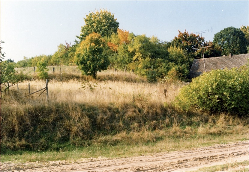 Der Sandweg im Vordergrund ist die Triftstraße, und wir blicken hier auf den Standort des Hauses Nr. 13a, welches zu dieser Zeit natürlich noch nicht existierte, sondern erst im Herbst 1993 gebaut wurde (siehe nächste Seite) und damit der erste Neubau hier oben war. Rechts im Hintergrund schaut das Dach der Nr. 14 hervor (heute die Tischlerei Herbst).