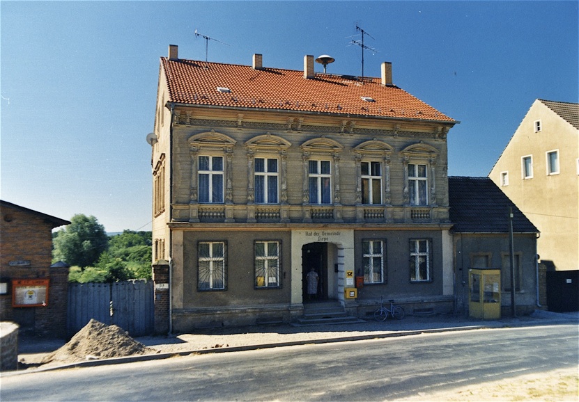 Das Jahr 1994 brachte die ersten wirklich sichtbaren Veränderungen mit sich (was vor allem den Dorfkern betrifft); die Poststelle z.B. zog von der Ernst-Thälmann-Straße in die Karl-Liebknecht-Straße 1 um, also ins Gemeindehaus, wie am Bild oben zu sehen ist, und vor allem: das Rundteil erfuhr eine komplette Neugestaltung und mit ihm der gesamte Fußgängerbereich ringsherum, wie man hier an den Bordsteinen unschwer