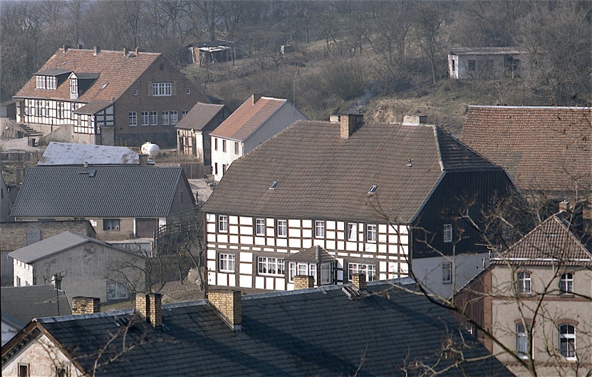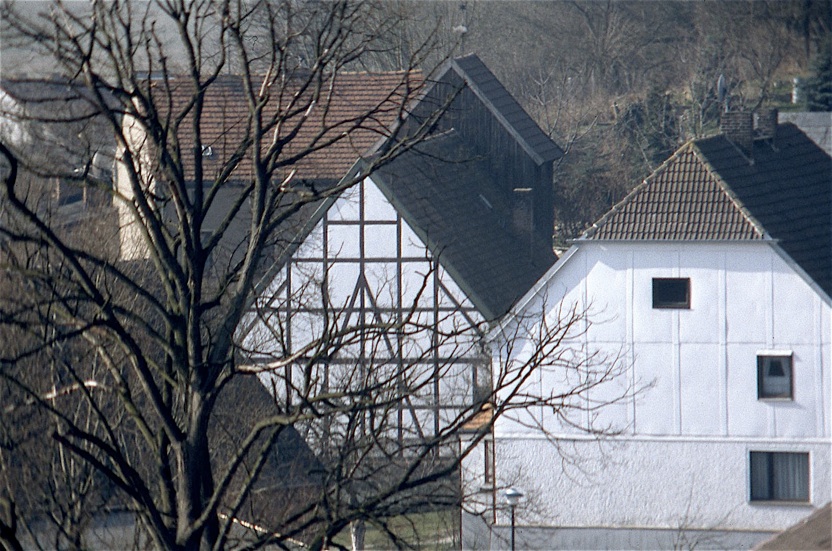 Hinten links sieht man sehr schön die Bergschule und in der Mitte natürlich dominierend das große Bauernhaus von Schumacher (vormals Gehricke), bei dem man wieder das Fachwerk zum Vorschein brachte (viele Jahre war es nämlich mit hellen Platten überdeckt.
