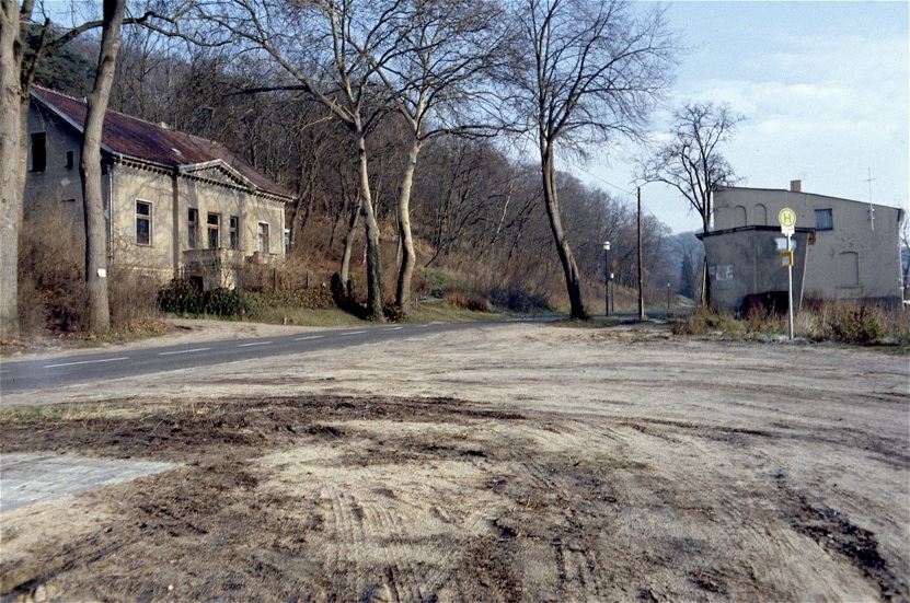 Dieses Bild zeigt die Wendeschleife im Vordergrund, die hier eher wie eine Sandwüste wirkt. Sie wurde in späteren Jahren asphaltiert.