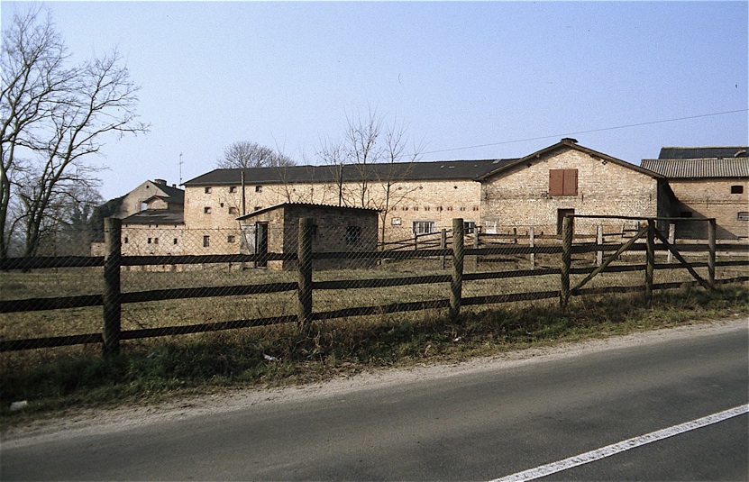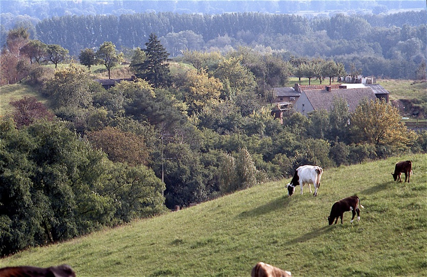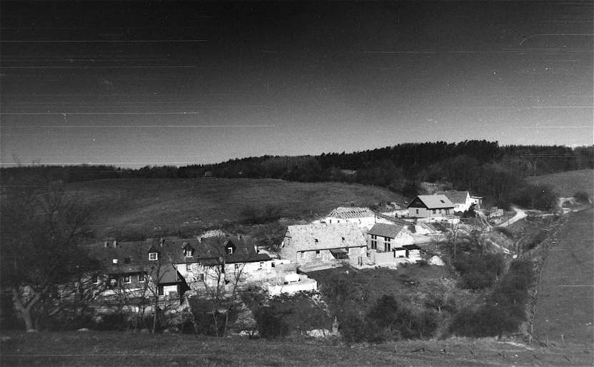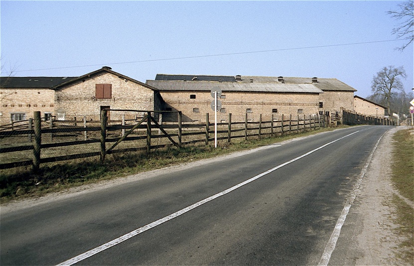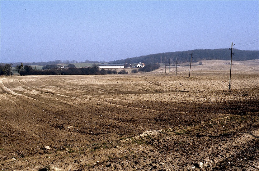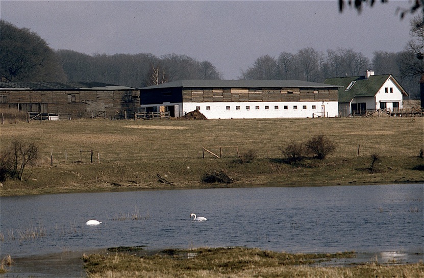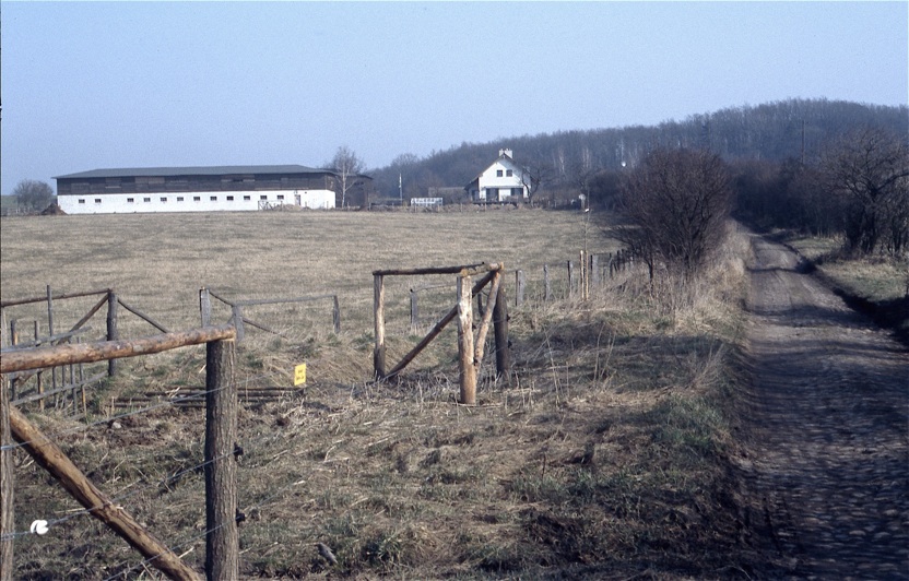 Wieder unten im Dorf angekommen blicken wir von Osten her auf die ehemaligen Schweineställe des Gutshofes (heute Landhof). Die Umzäunung ist hier noch recht jung, dieser hintere Bereich diente eine Zeit lang als Bullen-Auslauf und ist inzwischen Parkplatz. (Aufnahmen vom 11. März 1995)