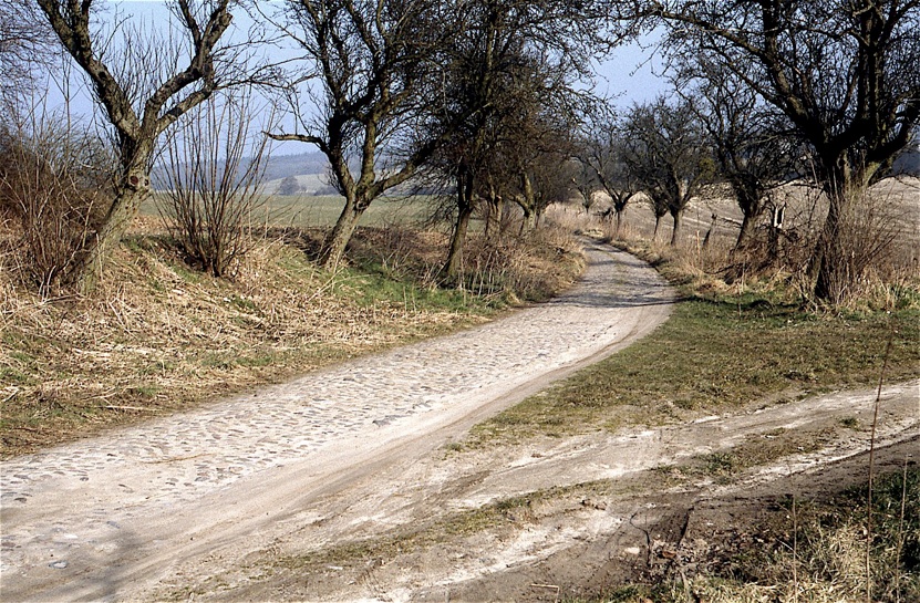 Die alte Apfelallee; links (nicht sichtbar) erhebt sich der Pfingstberg unmittelbar neben der Straße, nach rechts zweigt der Weg zum Steinberg ab.