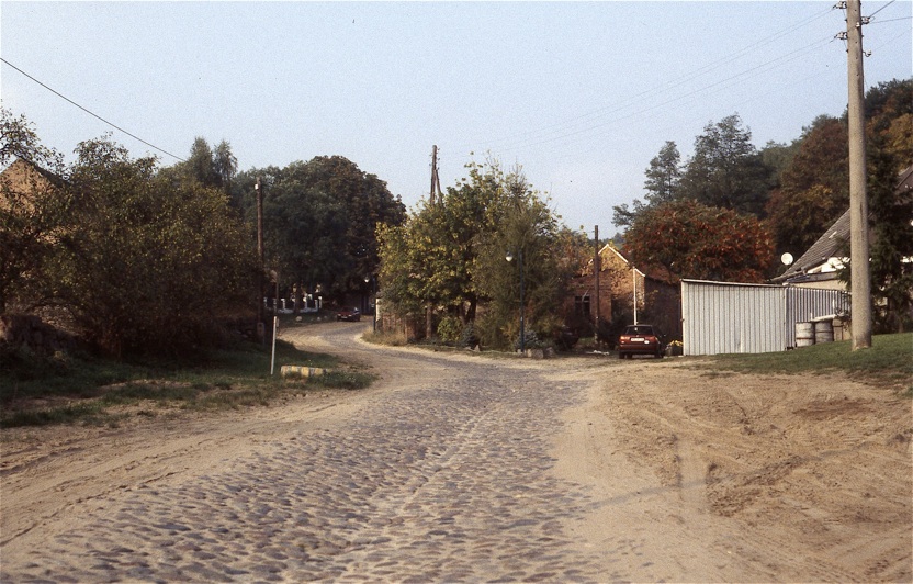 Der untere Bereich der Triftstraße; ganz links schimmert der Giebel von Voigts Scheune durch die Bäume.