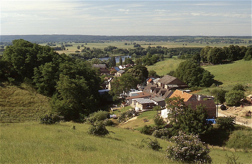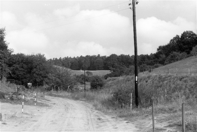 Blick über die Triftstraße hinweg (sie ist hier hinter den Bäumen und Büschen nicht zu sehen) zum Mühlenberg, dessen Plateau hinten links zu erkennen ist - dort oben stand einst die Mühle.