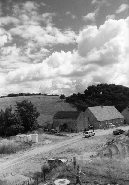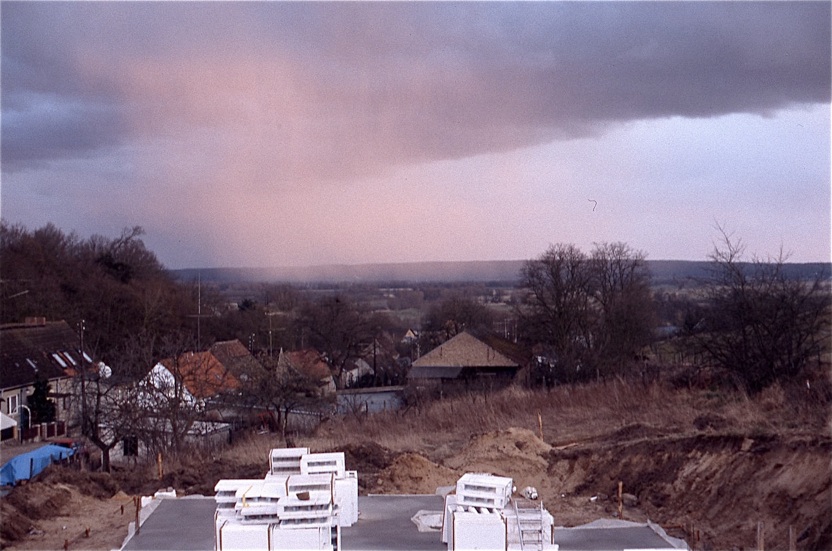 Ein Blick aus dem Giebelfenster unseres Hauses (dem ersten Neubau in der Triftstraße nach der Wende) in Richtung Süden zeigt die Grundplatte des nächsten neu entstehenden Hauses (Nr. 13b) sowie das noch nicht bebaute Brachland dahinter; der Giebel von Melcherts Scheune ist also noch gut zu erkennen. Auch den Verlauf der Triftstraße nach unten hin konnte man damals noch gut verfolgen. Auslöser für dieses Foto war lediglich der seltsame „rote Regen“ im Hintergrund, ohne ihn wäre dieses Bild nie entstanden (aufgenommen im März).