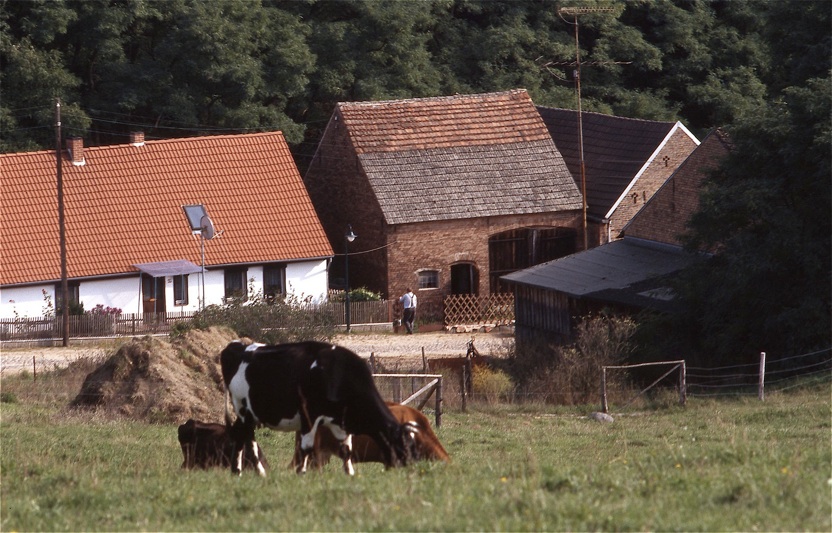 Die nächsten drei Bilder nun zeigen die Triftstraße, wobei die folgende Aufnahme ein schlichter Blick mitten ins Geschehen ist, ich stehe dabei auf der Kuhkoppel zwischen den Rindern und weiß heute selbst nicht mehr, wozu ich diese Szene festhielt, vielleicht um das lebendige Dorftreiben einzufangen, denn - und das ist unumstritten - Menschen beleben in bestimmter Weise solche Momente, auch wenn sie nur entfernt zu sehen sind.