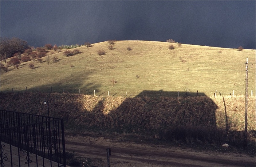 Bei klarem Wetter hat man ein wunderbares Panorama und zu Silvester um 24 Uhr hier oben zu verweilen, ist schon etwas ganz besonderes. Zunächst aber blicken wir beim folgenden Bild aus dem Fenster über die Triftstraße hinweg auf den Westhang des Bergs, der hier noch recht kahl wirkt, die Sträucher sind noch sehr klein und teilweise noch gar nicht vorhanden. Eine Gewitterfront zog gerade durch den Ort und lässt den östlichen Himmel dunkel erscheinen.