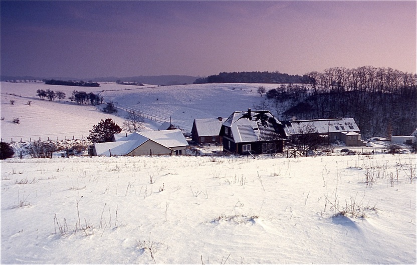 Wir beginnen diese Seite mit einer Winteraufnahme, wobei ich hier lediglich noch weiß, dass sie vom Winter 1995/96 stammt, also von jenem besonders harten Winter, der mehr als vier Monate Dauerfrost bei relativ wenig Schnee brachte. Tag und Monat sind mir bei diesem Foto leider nicht mehr bekannt, wobei die schon etwas „stärkere“ Schneedecke etwa auf den Februar schließen lässt. Zu sehen sind die Häuser der oberen Triftstraße von der Westseite, wobei die letzten beiden Neubauten hier noch fehlen.