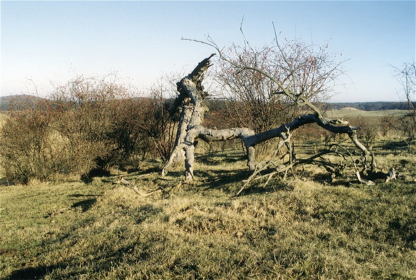 Wie schon auf der Seite „1995“ erwähnt, nimmt die Zahl der alten Apfelbäume auf dem Lieper Plateau in recht rasantem Tempo ab. Viele findet man nur noch in diesem Zustand, in welchem sie potentielle Nistplätze z.B. für den Wiedehopf darstellen, der hier tatsächlich vorkam und von mir im Jahre 2003 auch gehört wurde, jedoch gelang bis jetzt (2008) kein Sichtnachweis.
