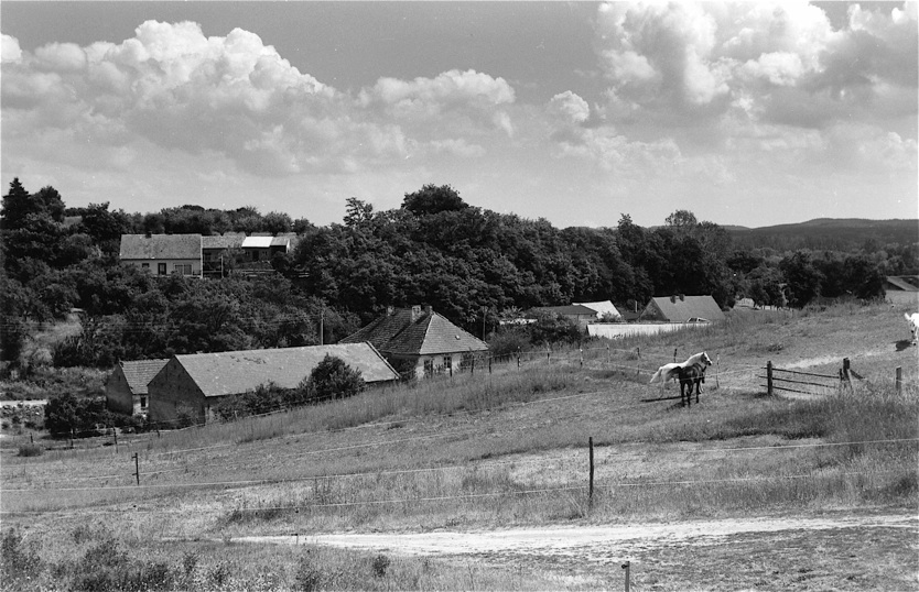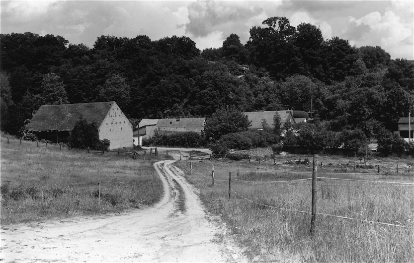 Von der Anhöhe des Friedhofs geht der Blick zur Triftstraße, immer noch dominiert in diesem Bereich Voigts Scheune, die aber von diesem Zeitpunkt an nur noch gut zwei Jahre stand. Ihre Westwand war hier bereits nahezu vollständig eingestürzt, nur sieht man es auf dem Bild nicht richtig, da sie beschattet ist.