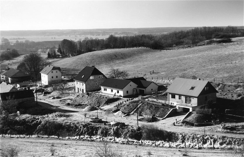Immer noch fehlt der letzte Neubau (Haus Nr. 15a), die Lücke ist gut zu erkennen, wobei man nochmals betont sei, das die Nummernvergabe hier oben etwas verwirrend ist, was mit dem unterschiedlichen Bauzeitpunkt der neuen Häuser zusammenhängt und natürlich mit der Reihenfolge: das letzte z.B. stand zuerst, dann wurde rückwärts nach unten gebaut, den Nummern 13a und 13b folgte schließlich die 15, da die 14 bereits an einen Altbau (das letzte Haus in der Straße) vergeben war, und nach der 17 kam als letztes die 15a (der hier noch fehlende Neubau), denn die 16 hatte sich ein Gartenbesitzer einige hundert Meter nördlich am Waldrand selbst gegeben, was offenbar akzeptiert wurde.