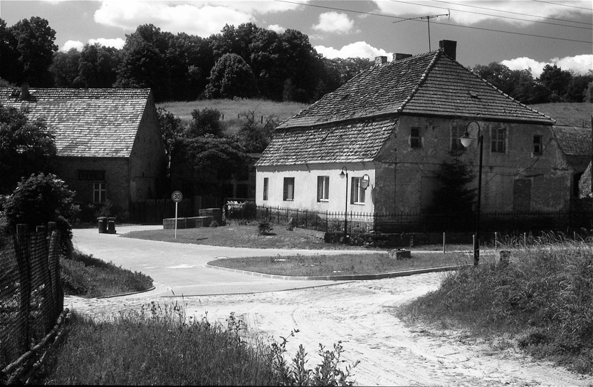Wir blicken von der Parsteiner Straße her, die sich in diesem Bereich gabelt und vor uns in die Triftstraße übergeht, während sie hinter uns hinauf zum Mühlenberg bzw. an diesem vorbei und dann weiter zum Vorwerk und schließlich nach Parstein führt.