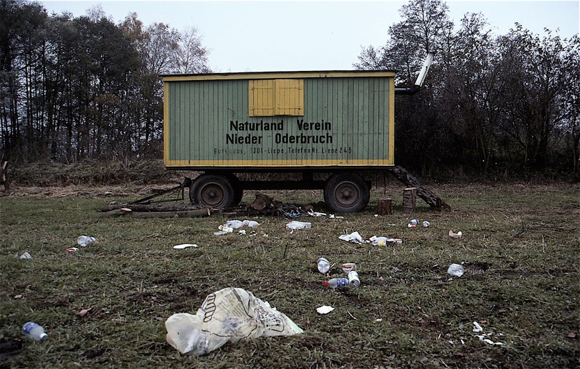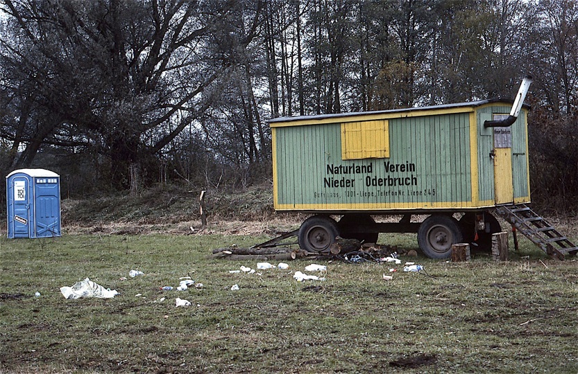 Hier nun zwei Bilder mit Beispielen, wie es eigentlich nicht sein sollte. Natürlich ist es verständlich, dass man gefüllte Müllsäcke (in diesem Fall Gelbe Säcke) nicht über Nacht und schon gar nicht über´s Wochenende im Wagen stehen lassen möchte. Doch was passieren kann, wenn man sie draußen abstellt, belegen diese Aufnahmen vom 31. Oktober. Über den Übeltäter kann man spekulieren, der erste Gedanke sind sicherlich immer die Wildschweine, doch findet man keinerlei „Gebrochenes“ (also umgewühlte Erde) ringsherum - wie auch immer, auf jeden Fall zeigen die Bilder eine paradoxe Szenerie, so etwas passt am allerwenigsten zu einem Naturland-Verein. Im Hintergrund erkennt man einen Deich, es ist der Weg zur Lieper Schleuse (wenn man hinter der Brücke nach rechts abbiegt), der Wagen steht hier etwa in Höhe der Einmündung des Freigrabens in den Kanal (ca. 100 m stromaufwärts). Für diese Fotos wurde der Kodachrome 64 PKR Diafilm verwendet.