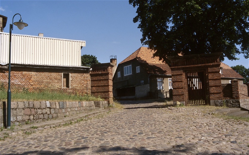Die Einfahrt zum Gutshof mit dem alten Gutshaus - der ehemaligen Goethe-Schule; zur rechten Hand, hinter der flachen Mauer befand sich der Schulhof. Bis 1991 wurden hier die ersten bis vierten Klassen unterrichtet. (Foto: 11. Juni)
