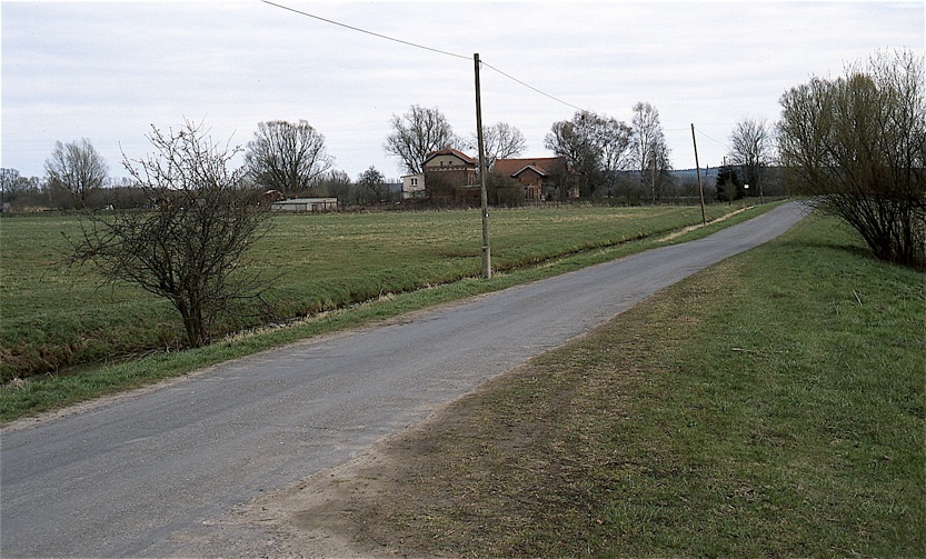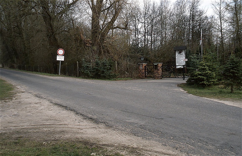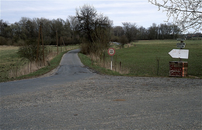 Kurz hinter der Lieper Brücke (südwärts) zweigt an der kleinen Kreuzung nach links die besagte schmale Straße nach links ab, in die wir hier schauen. Das große weiße Schild weist den Weg zum Jägerhof. Wie relativ häufig diese Straße im Gegensatz zu den anderen beiden Richtungen genutzt wird, sieht man daran, wie frei gefahren sie ist, während die übrige Kreuzung z.T. mit Sand und Steinchen bedeckt ist.