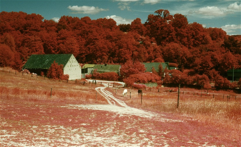 Unschwer zu erkennen ist auch die unterschiedliche Intensität der Infrarot-Reflexion der Pflanzen, was sich in verschiedenen Rottönen äußert: die Bäume im Hintergrund sind anders gefärbt als das Gras der Koppeln und wieder anders sieht der Grasanflug des Weges im Vordergrund aus.