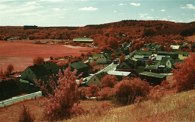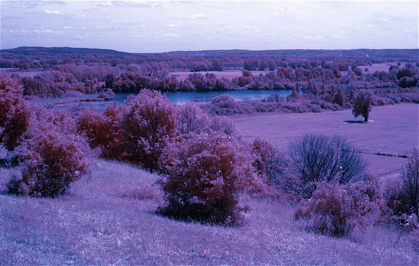 Die Landschaft zeigt schon im Original viele verschiedene Grüntöne, was im Infrarotbereich erst recht zu Abstufungen führt (hier natürlich als rot zu sehen), und auf diese Weise lassen sich bei wissenschaftlichen Auswertungen auch Aussagen über den Gesundheitszustand beispielsweise der Wälder machen.