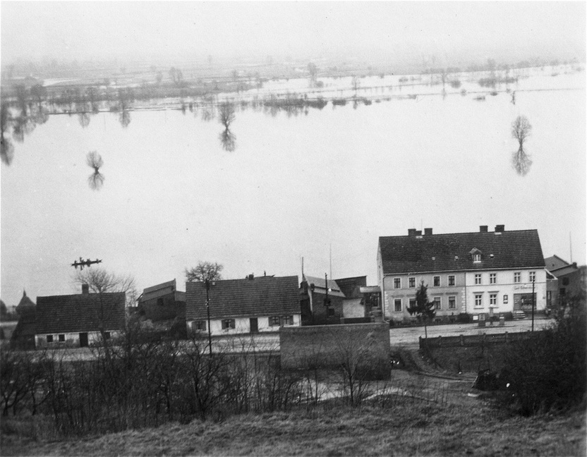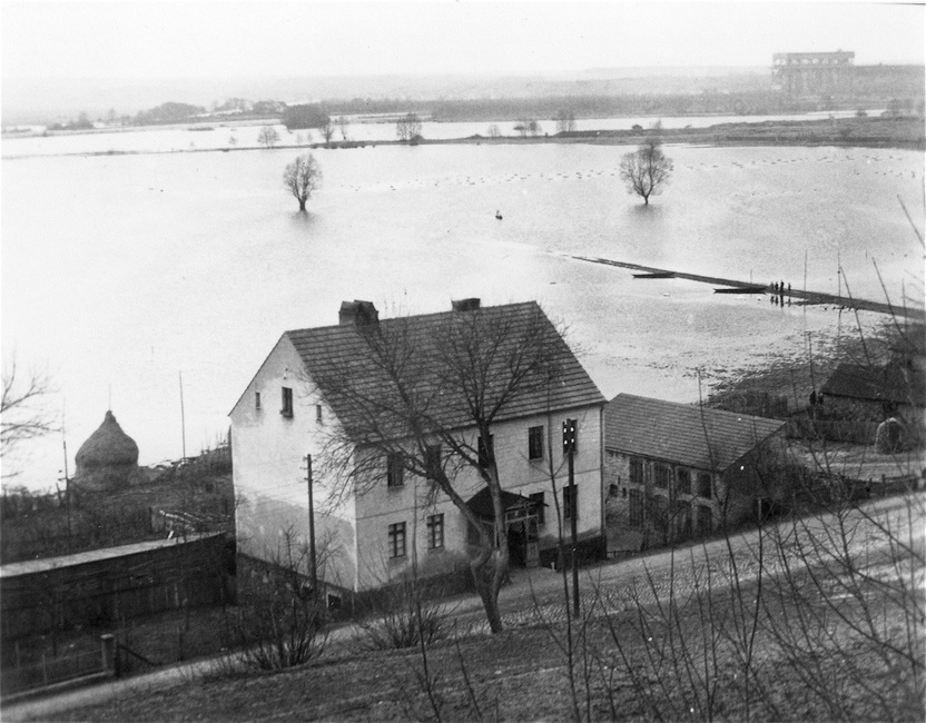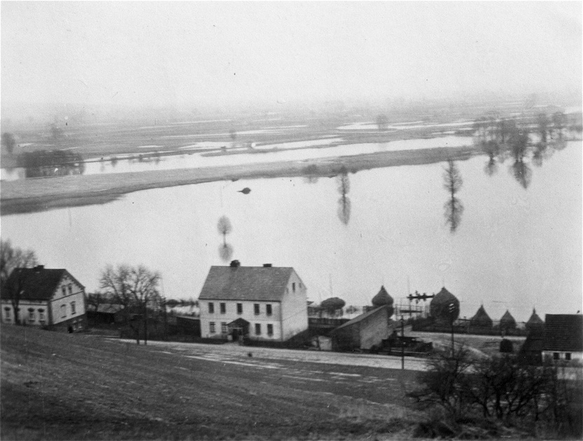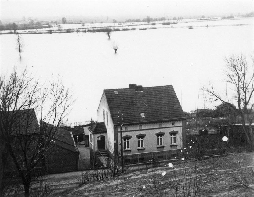 Das bekannte Haus der Familie Grothe (erbaut 1908) - damals hatte man von dieser Stelle noch freie Sicht. Was natürlich sofort auffällt: Die Wiesen waren wirklich flächendeckend überschwemmt. Es war ein starkes Frühjahrs-Hochwasser, die Bilder wurden im März aufgenommen - man sieht ja auch, wie kahl die Bäume noch sind.