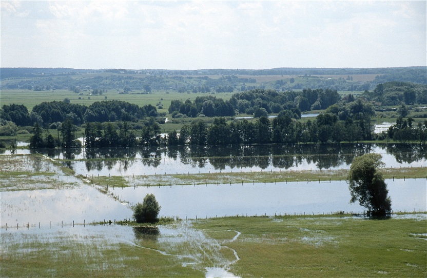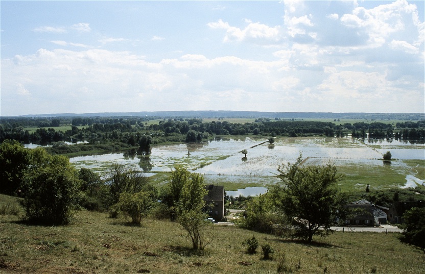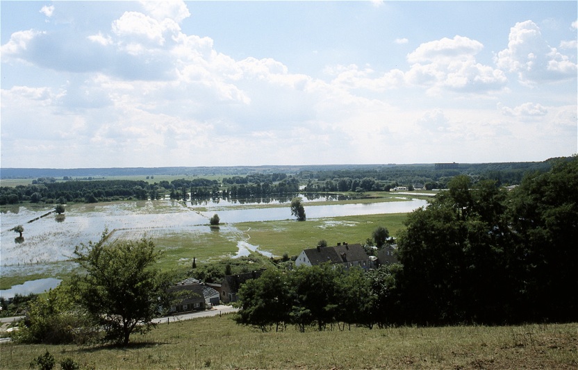 Man sieht die Lieper Wiesen bereits zum Großteil unter Wasser, während das Niederoderbruch im Hintergrund noch flächendeckend grün erscheint.