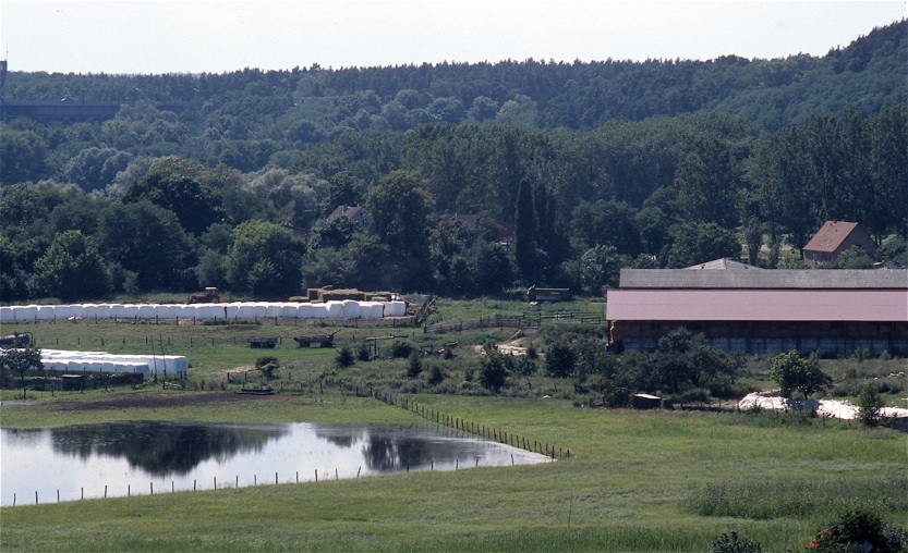 Der westliche Bereich der Wiesen, der auf den Bildern weiter oben durch Bäume verdeckt war, ist ebenfalls bis fast an den Weg heran überschwemmt, wir sehen auf dem linken Bild die Autowerkstatt (Flachbau) und auf dem rechten die Anlage der Weidewirtschaft, der Bildschwenk ist dabei unübersehbar.