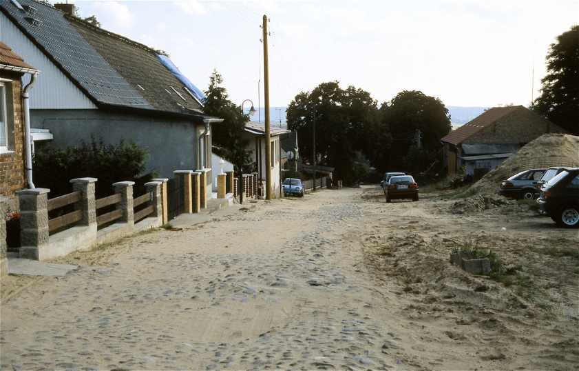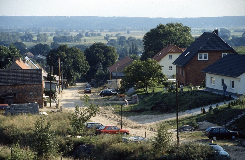 Der letzte Blick für diese Seite geht aus dem nördlichen Giebelfenster des vorletzten Hauses in der Triftstraße (dem ersten Neubau nach der Wende) über ein Stück des Nachbargrundstücks hinweg und zeigt eine kurzen Abschnitt der Triftstraße, während sich dahinter nach rechts Sacks Berg erhebt, von dem wir bereits manche eindrucksvolle Aussichten präsentieren konnten.