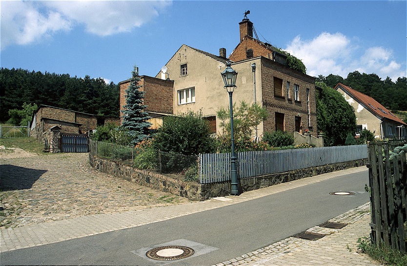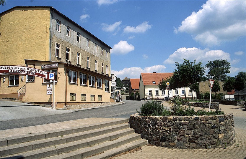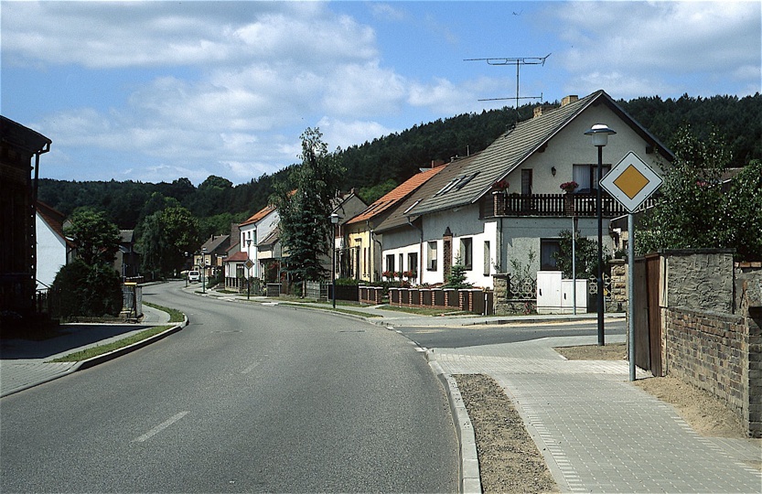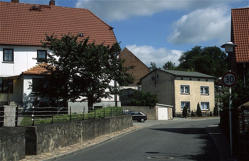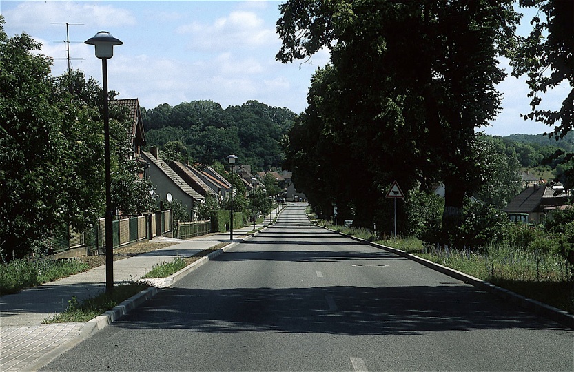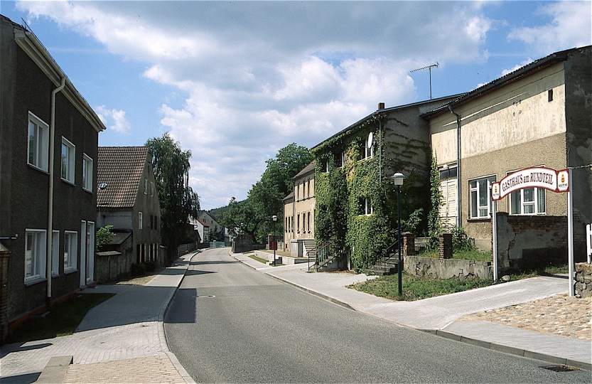 Ein bekannter Straßenzug aus der Dorfmitte, links sieht man das Haus der ehemaligen Fleischerei Illing, dahinter ehemals Torge; rechts der inzwischen zugerankelte „Lindenhof“ mit dem alten Saal davor. Das Schild ganz vorn bezieht sich allerdings auf das griechische Restaurant am Rundteil.