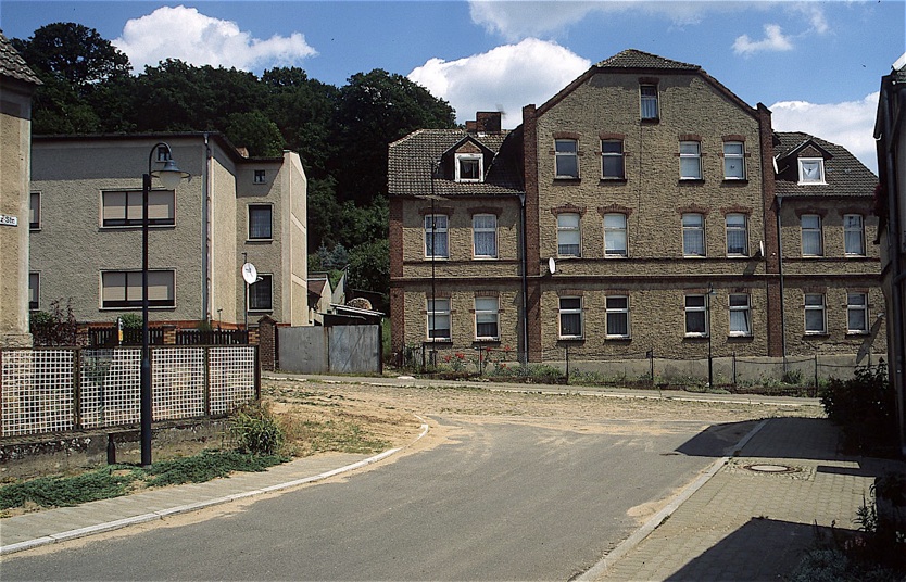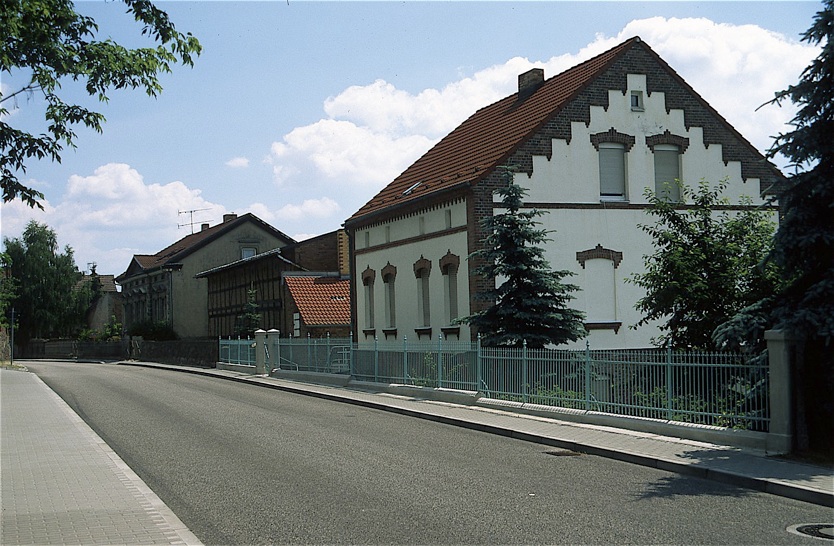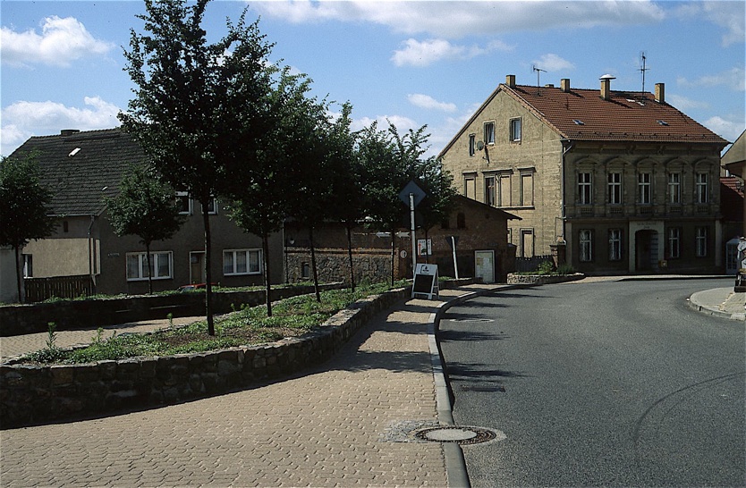 In die entgegengesetzte Richtung schauen wir zurück auf das markante Haus in der Karl-Liebknecht-Str 1, das ein Jahr später auch eine restaurierte Fassade erhielt, ein neues Dach hat es ja bereits. Auch innen wurden Umbauten vorgenommen, so dass man es heute teilweise nicht mehr wieder erkennt. In die einstigen Räume der Gemeindeverwaltung zog 1999 die Arztpraxis G. Neumann ein. (aufgenommen am 17. Juni)