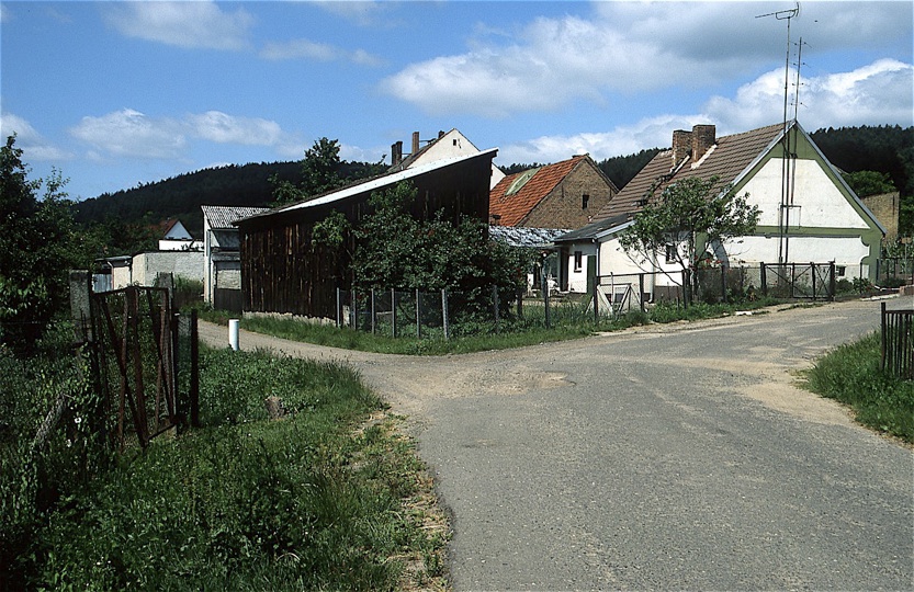 Ein Blick ins Dorf hinein; rechts erkennt man einige Neubauten, sie entstanden inzwischen auf dem Gelände der ehemaligen Hühnerfarm, sind aber sonst auf dieser Web-Site nicht weiter erwähnt. (aufgenommen am 17. Juni)