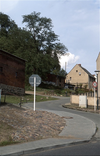 Rechts sieht man den Abzweig der Brodowiner Straße, dahinter das Haus Nr. 17, das sich seit der Wende besonders verändert hat. Die Vergleichsaufnahmen von damals (mit Teleobjektiv aus dem Dachfenster) machen das deutlich.
